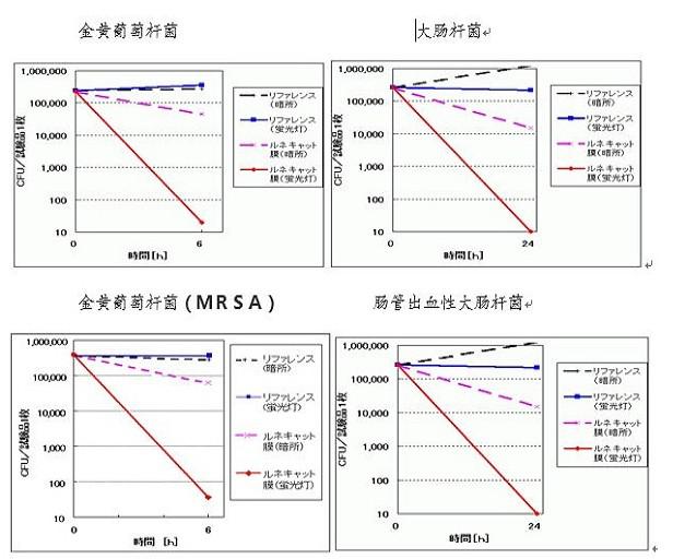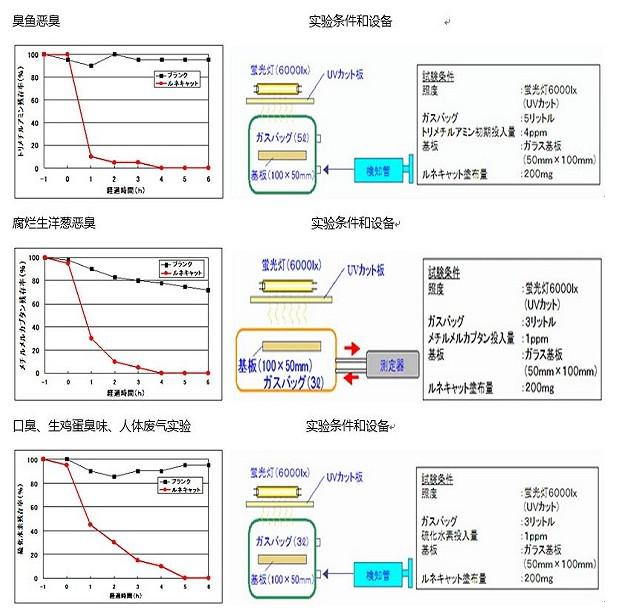 是把氧化钨合成体,加工成10nm以下的微粒子状技术,表面纳米结构的最合适化适化,纳米原子配置激活处理,来扩大光吸收频带,即使是250lx以下的可视光条件下也能充分获得效果。与从前的氧化钛系材料和乙醛气体的分解同荧光灯(1000lx、250lx),白色LE(250lx)进行比较。在250lx环境下,有着比以前氧化钛系光触媒30倍以上的气体分解能力。蛍光灯1000lx中能够分解70%的乙醛气体。