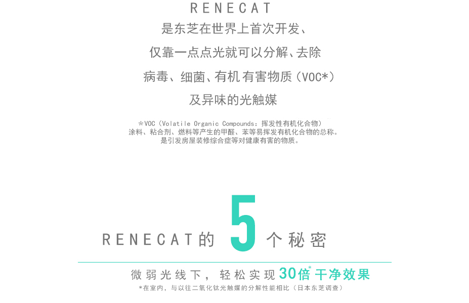 现在市面上广泛使用的氧化钛系列光触媒,主要是与紫外线反应,起到分解、催化作用,而且主要是用在室外外墙涂料上,即使开发出来的可视光光触媒,要使其充分反应需要6000Lx的照度,如果室内没有足够强的照明强度,则无法发挥其光催化效应。东芝研发的氧化钨光触媒是在即使在室内等低发光强度的环境下具有超强的分解、抗菌、消臭、催化能力,是室内用光触媒的划时代产品。