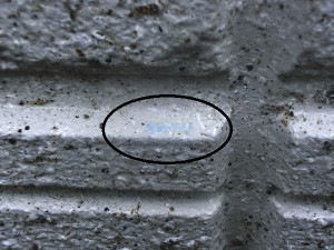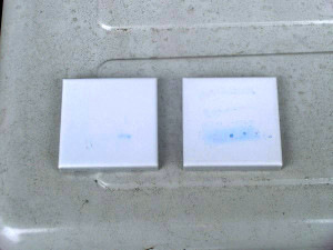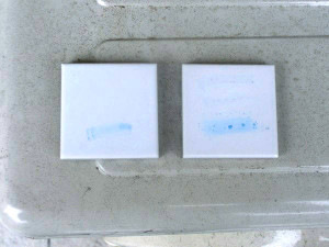 验证光触媒有无氧化分解反应的最直观的方法就是亚甲蓝的脱色实验。亚甲蓝是一种蓝色的有机物,可以通过它观察到光触媒因氧化分解而脱色的过程。本次是将亚甲蓝涂抹在外墙上来观察其是否脱色。作为对比的是涂抹了光触媒H1的瓷砖和未经过加工的普通瓷砖,在2种瓷砖上都涂抹了亚甲蓝,从而观察脱色情况。