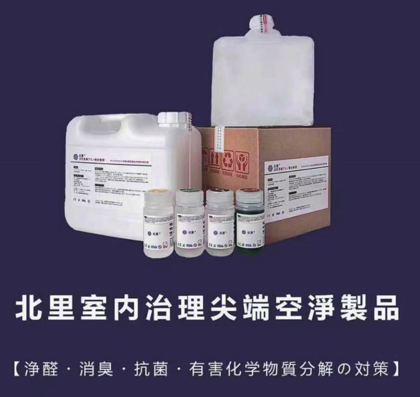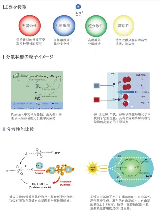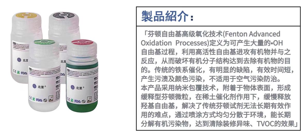 芬顿自由基高级氧化技术(Fenton Advanced Oxidation Processes)定义为可产生大量的・0H 自由基过程,利用高活性自由基进攻有机物并与之 反应,从而破坏有机分子结构达到去除有机物的目 的。传统的铁系催化,有明显的缺陷,有效时间短, 产生污溃及颜色污染,不适用于空气污染防治。 本产品釆用纳米包覆技术,附着于物体表面,形成 缓释型芬顿微粒,在稀土催化剂作用下,缓慢释放 羟基自由基,解决了传统芬顿试剂无法长期有效作 用的难点,通过喷涂方式均匀分散于环境,能长期 分解有机污染物,达到清除装修异味、TVOC的效果」