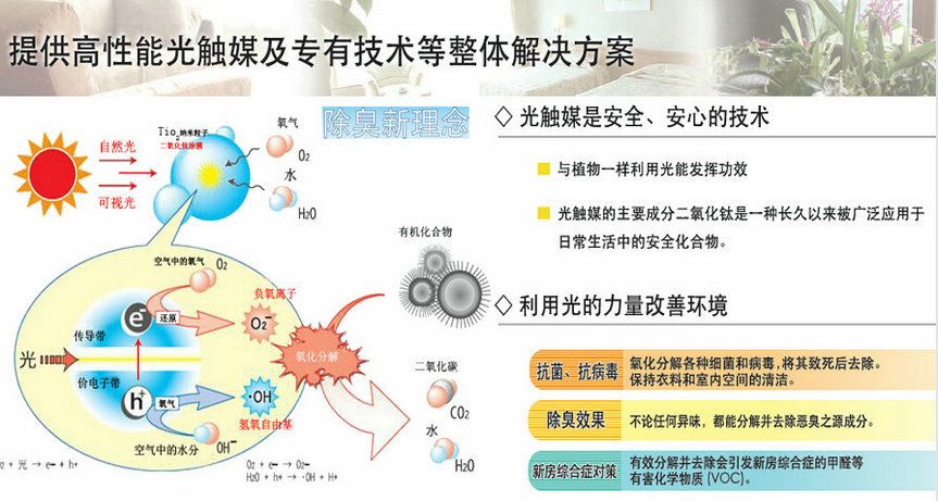 水分子,产生活性力强的负氧离子和氧化氢离子,将室内空气中有机污染物,如甲醛、苯系物、等有害气体分解成水分子和CO2,达到治理室内空气污染的目的。不同光触媒去除空气污染物的效率有很大差异,不同条件下不同检测方法测得的去除效率差异也较大。按多数检验机构自己制定的实验室方法(1m3 小型气候箱法)进行的检验,条件最有利于去除效率的提高。原因是开启紫外灯,促进光触媒在光能下激发活性分子,污染源无持续挥发能力,即使无光触媒激发,空气污染物浓度也会缓慢下降。此方法无法表征光触媒去除污染物的持续能力,使消费者无法甄别各类产品质量的优劣。这些条件也不符合室内家居空气污染物的持续挥发性及治理及室内家居的温度湿度条件。从表可以看出,光触媒的致命弱点是,必须有可见光才可以产生显著的治理效果,现在有一些产品可不须要太阳光照就有一定的治理效果,但是最难的技术指标- 无可见光条件下去除效率远未达到要求。国家各级研究部门应加大研究力度,突破这一技术瓶颈.