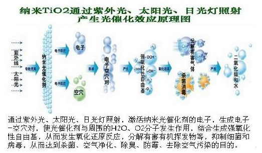 光触媒在特定波长(388nm)的光照射下,会产生类似植物中叶绿素光合作用的一系列能量转化过程,把光能转化为化学能而赋予光触媒表面很强的氧化能力,可氧化分解各种有机化合物和矿化部分无机物,并具有抗菌的作用。在光照射下,光触媒能吸收相当于带隙能量以下的光能,使其表面发生激励而产生电子(e-) 和空穴(h+)。这些电子和空穴具有很强的还原和氧化能力,能与水或容存的氧反应,产生氢氧根自由基(·OH)和超级阴氧离子(·O )。如表1所示,这些空穴和氢氧根自由基的氧化能大于120kcal/mol,具有很强的氧化能力,几乎能将所有构成有机物分子的化学键切断分解。因此可以将各种有害化学物质、恶臭物质分解或无害化处理,达到净化空气、抗污除臭的作用。
