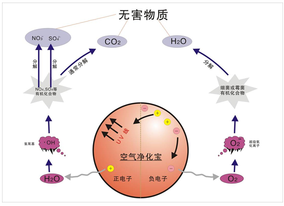 二氧化钛半导体当吸收了能量大于或等于带隙能宽度(3.0~3.2 ev)的光子后进入激发态,此时价带上的电子跃迁禁带进入导带,在导带上产生带负电的高活性电子,同时在价带上产生相应的带正电的空穴,高活性电子与氧生成,空穴在半导体体内形成非常活跃的自由基,各种有机物能被氧化剂完全降解为无害的物质。在没有外界电子及氧化物时,电子与空穴可以重新复合。