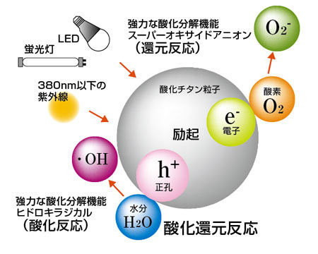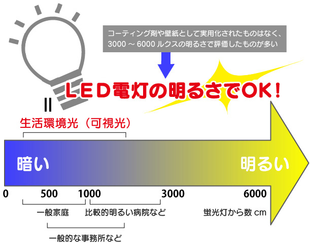 在可视光应答型光触媒的性能试验中使用的光源是JISR1750「室内证明环境中使用的光触媒实验用光源」中规定的。这里使用的是“宽频带发光型荧光灯的普通白色型(记号W)”同时根据需要也使用“3波长域发光形白色”(记号EW或者EW-W)。由于制造商之间差距不大就采用了常用于公共设施的照明的荧光灯。除此以外荧光灯还有“灯泡色(记号L)昼白色(记号N)、昼光色(记号D)”等品种。这些不同颜色是由于温度不同造成的。温度越高颜色就越白。(顺便一提灯泡色的温度为3000k、白色为4000k、昼白色为5000k)但是在灯具店基本找不到白色的荧光灯,多数为灯泡色、昼白色与昼光色三种颜色。虽然没有通过光谱进行精确的比较,但是温度越高,青色等的波长短的光的比例要多一点。