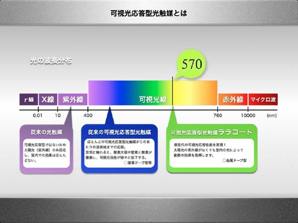 可视光应答型光触媒的JIS实验中,消除了紫外线,只用可视光进行光触媒性能测试。但实际住房中大多住宅有很多窗户,因此有可能有少量太阳光中的紫外线也会有所干扰。开发试验中只测试了可视光应答性能,实际使用中原有的紫外线应答型光触媒也能被激活。因此根据光触媒使用的环境与条件,使用何种类型的光触媒有必要进行讨论。