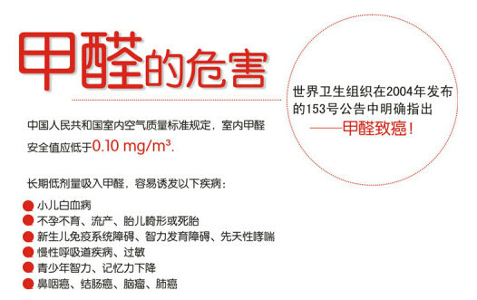 人体危害有关资料表明:室内空气污染比室外高5~10倍,室内空气污染物多达500多种。室内空气污染已成为多种疾病的诱因,而甲醛则是造成室内空气污染的一个主要方面。 甲醛对健康危害主要有以下几个方面: a、刺激作用:甲醛的主要危害表现为对皮肤黏膜的刺激作用,甲醛是原浆毒物质,能与蛋白质结合、高浓度吸入时出现呼吸道严重的刺激和水肿、眼刺激、头痛。 b、致敏作用:皮肤直接接触甲醛可引起过敏性皮炎、色斑、坏死,吸入高浓度甲醛时可诱发支气管哮喘。 c、致突变作用:高浓度甲醛还是一种基因毒性物质。实验动物在实验室高浓度吸入的情况下,可引起鼻咽肿瘤。 d、突出表现:头痛、头晕、乏力、恶心、呕吐、胸闷、眼痛、嗓子痛、胃纳差、心悸、失眠、体重减轻、记忆力减退以及植物神经紊乱等;孕妇长期吸入可能导致胎儿畸形,甚至死亡,男子长期吸入可导致男子精子畸形、死亡等。 毒理学资料及环境行为 急性毒性:LD50800mg/kg(大鼠经口),2700mg/kg(兔经皮);LC50590mg/m³(大鼠吸入);人吸入60~120mg/m³,发生支气管炎、肺部严重损害;人吸入12~24mg/m³,,鼻、咽黏膜严重灼务、流泪、咳嗽;人经口10~20mL,致死。 亚急性和慢性毒性:大鼠吸入50~70mg/m³,1小时/天,3天/周,35周,发现气管及支气管基底细胞增生及生化改变;人吸入20~70mg/m³×长时间,食欲丧失、体重减轻、无力、头痛、失眠;人吸入12mg/m³×长期接触,嗜睡、无力、头痛、手指震颤、视力减退。 致突变性:微生物致突变:鼠伤寒沙门氏菌4mg/L。哺乳动物体细胞突变:人淋巴细胞130μmol/L。姊妹染色体交换:人淋巴细胞37pph。 生殖毒性:大鼠经口最低中毒剂量(TDL0):200mg/kg(1天,雄性),对精子生存有影响。大鼠吸入最低中毒浓度(TCL0):12μg/m³,24小时(孕1~22天),引起新生鼠生化和代谢改变。 致癌性:IARC的致癌性评论曾为“动物阳性;人类不明确”,后经过进一步研究,在2006年确定为1类致癌物(即对人类及动物均致癌——"sufficient evidence of carcinogenicity")。 代谢和降解: 环境中甲醛的主要污染来源是有机合成、化工、合成纤维、染料、木材加工及制漆等行业排放的废水、废气等。某些有机化合物在环境中降解也产生甲醛,如氯乙烯的降解产物也包含甲醛。由于甲醛有强的还原性,在有氧化性物质存在条件下,能被氧化为甲酸。例如进入水体环境中的甲醛可被腐生菌氧化分解,因而能消耗水中的溶解氧。甲酸进一步的分解产物为二氧化碳和水。进入环境中的甲醛在物理、化学和生物等的共同作用下,被逐渐稀释氧化和降解。 甲醛的氧化降解过程如下:2HCHO+O₂→2HCOOH₂HCOOH+O₂→2H₂O+2CO₂ 残留与蓄积: 资料记载,工业企业区土壤中吸附的甲醛含量可达180~720mg/kg干土。土壤的污染可导致地下水污染,水中甲醛含量可以比表层土高出10~20倍。 甲醛在环境中颇稳定,当水中甲醛浓度为5mg/L时(20℃),观察结果表明,5天内可以保持恒定。水中甲醛浓度为<20mg/L时,可以被曝气池中经驯化的微生物降解消化。而含量为100mg/L时,能抑制微生物对有机物的氧化。当水中甲醛含量为500mg/L时,生物耗氧过程全部中止,水中微生物被杀死。 迁移转化: 甲醛由于沸点低又易溶于水,所以主要通过大气和水排放进入环境。生产甲醛的工厂其未处理的气体,当排放高度为18米时,其距工厂250~500米的大气样品中,甲醛含量均在0.035mg/m³以上。1000米远在大气中甲醛浓度在嗅阈以下。以甲醛作鞣剂生产塑料的企业周围大气中的甲醛浓度在嗅阈以下。以甲醛作鞣剂生产塑料的企业周围大气中的甲醛浓度距厂区100米内为0.012mg/m³;200米处36个样品中有15个浓度低于0.012mg/m³;400米处均低于0.012mg/m³。 工业废水中排放的甲醛含量由于行业不同有很大差别,其中浓度最高的甲醛废水是生产酚醛树脂的上层焦油废水,含甲醛量高达2.5%。 危险特性:其蒸气与空气形成爆炸性混合物,遇明火、高热能引起燃烧爆炸。若遇高热,容器内压增大,有开裂和爆炸的危险。 燃烧(分解)产物:一氧化碳、二氧化碳。