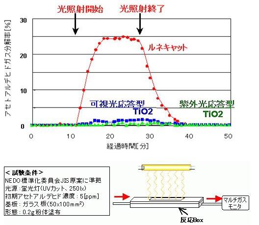 是把氧化钨合成体,加工成10nm以下的微粒子状技术,表面纳米结构的最合适化适化,纳米原子配置激活处理,来扩大光吸收频带,即使是250lx以下的可视光条件下也能充分获得效果。与从前的氧化钛系材料和乙醛气体的分解同荧光灯(1000lx、250lx),白色LE(250lx)进行比较。在250lx环境下,有着比以前氧化钛系光触媒30倍以上的气体分解能力。蛍光灯1000lx中能够分解70%的乙醛气体。