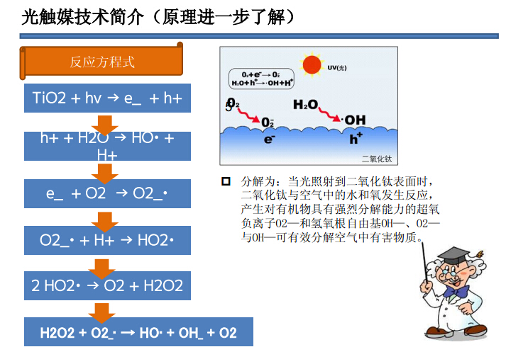 光触媒技术是1967年东京大学的教授本多建一教授跟当时的研究生藤岛昭偶然发现的。光触媒的主要成分是纳米级二氧化钛(TiO2)。这一产品喷涂于墙面后,可形成一层薄膜,通过吸收阳光中的紫外线发生光催化作用,产生活性氧和氢氧自由基,对空气中的有害化学物质进行降解,尤其对甲醛、苯、氨和TVOC(总挥发性有机物)等有害物质具有较强的降解能力。不仅如此,光触媒产品还具有很强的灭菌功能。实验室检测结果证明,光触媒对大肠埃希氏菌、肺炎克雷伯氏菌以及军团菌都具有极强的杀灭能力。由于光触媒本身无毒,在治理过程中不会对环境产生二次污染,而且只要不脱落永久有效,因此引起了全球环保行业的广泛应用。