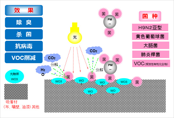 光触媒产品是目前国际上渐趋流行的一种新型环保材料,其主要成分是纳米级二氧化钛。这一产品喷涂于墙面后,可形成一层薄膜,通过吸收阳光中的紫外线发生光催化作用,产生活性氧和氢氧自由基,对空气中的有害化学物质进行降解,尤其对甲醛、苯、氨和TVOC(总挥发性有机物)等有害物质具有较强的降解能力。不仅如此,光触媒产品还具有很强的灭菌功能。实验室检测结果证明,光触媒对大肠埃希氏菌、肺炎克雷伯氏菌以及军团菌都具有极强的杀灭能力。由于光触媒本身无毒,在治理过程中不会对环境产生二次污染,而且只要不脱落永久有效,因此引起了全球环保行业的广泛应用。