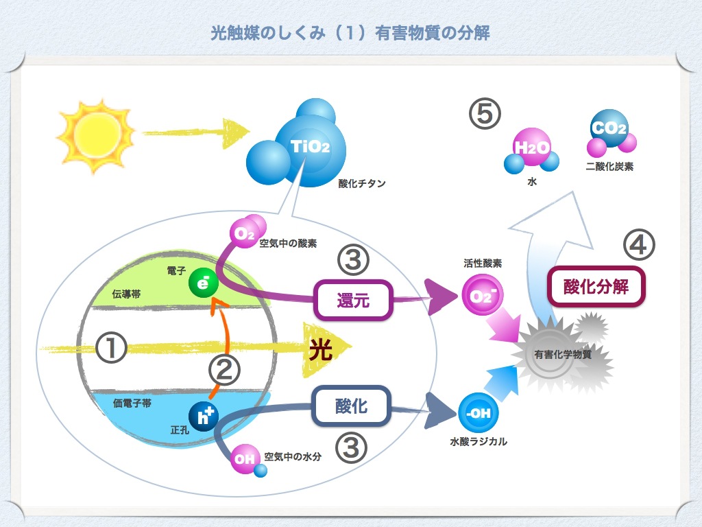 曾任教于东京大学的藤岛昭的团队,从1998年开始验证了光触媒的抗菌性能。在瓷砖的表面涂上一层薄薄的二氧化钛,将大肠杆菌放在瓷砖表面,光(紫外线等)照射时产生的有机物具有极强的分解能力可以杀灭细菌。