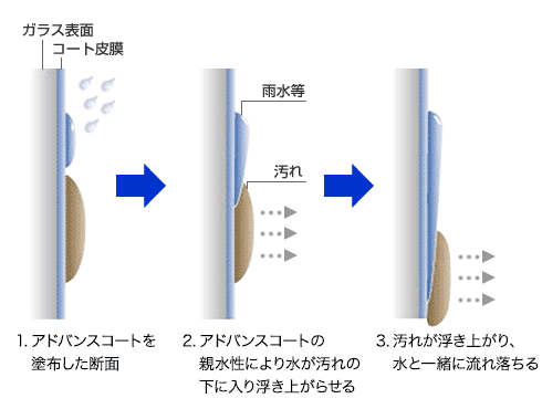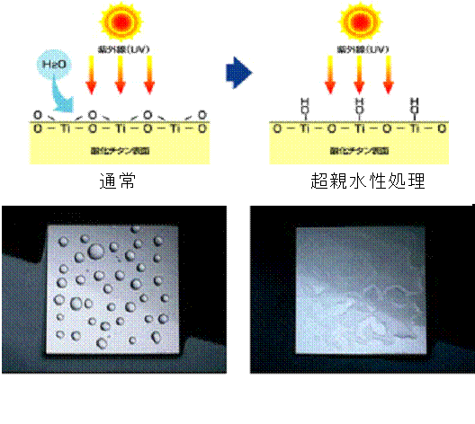 超亲水性能是一种附着在表面的水可以变薄变宽的性质,让水不形成水滴。在建筑物的外墙施工后,即使有油污等附着也能分解,下过雨后也会像清洗过一样干净如初。藤岛教授称之为自净能力。